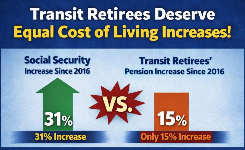 Transit retirees fall behind inflation every year. In some years, it’s by a little, and in some years, it’s by a lot. The reason for this incremental erosion is the formula used to determine the annual cost of living adjustment (COLA) in the New York City Retirement System, NYCERS and the MABSTOA pension plans. WHY ARE […]