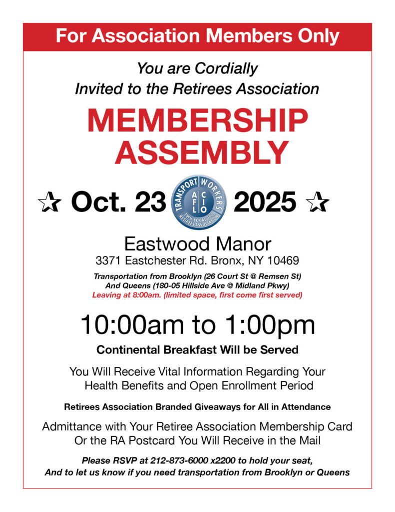 RA Annual Membership Assembly At the Eastwood Manor, Bronx, NY. Transportation available from Brooklyn and Queens + Add to Google Calendar + iCal / Outlook export Date Oct 23 2025 Time 10:00 am - 1:00 pm Share this event