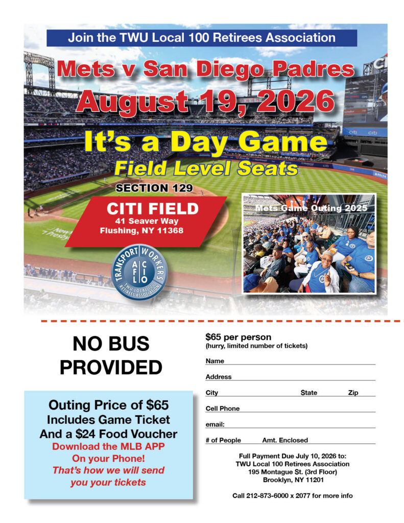 Retirees Outing to Citi Field Aug. 19, 2026 Mets v San Diego Padres / Day Game + Add to Google Calendar + iCal / Outlook export Date Aug 19 2026 Time 1:00 pm - 4:00 pm Share this event